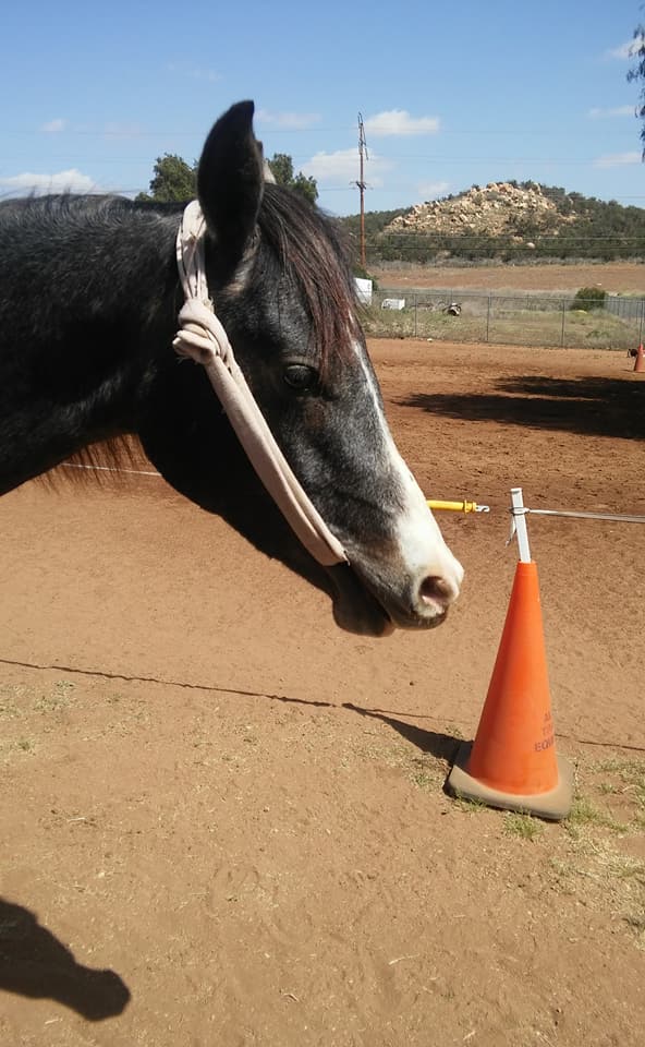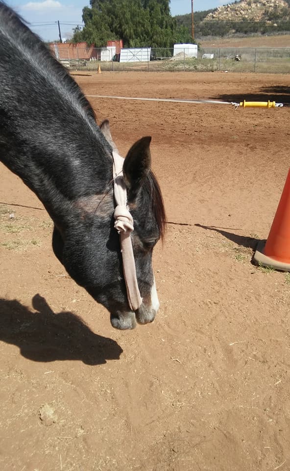For this wrap I recommend taking an old polo or standing wrap and cutting it to size. Start by doubling it over, hold the “loop” end on one side and put the wrap into the horses mouth just like a bit. Now take the “tail” ends up and over the horses poll (right behind the ears), just like a bridle. Insert the tail ends through the “loop”, adjust properly and tie a knot. Just like all the other wraps the rule is for it to fit SNUG… not too tight…not too loose. It should go right where a bit would sit in the horses mouth. These pictures show the wrap by itself but it can also go over/under a halter or cavesson for use while doing ground work or lunging if desired.